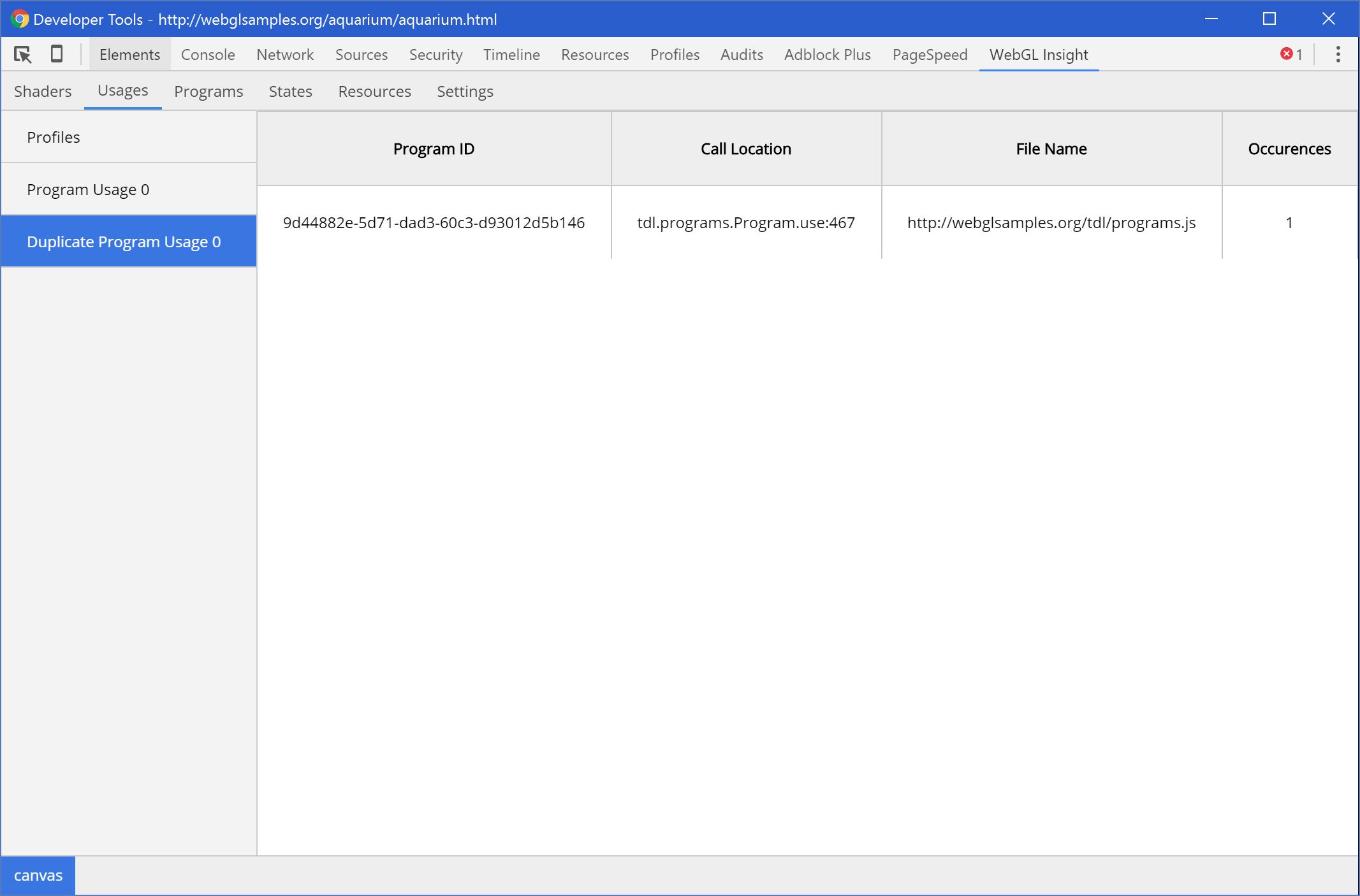 When the extension is installed, open up the Chrome DevTools panel, click on the "WebGL Insight" tab, and browse to a WebGL application.