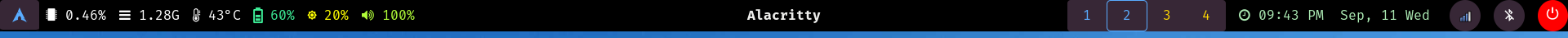 Newer, cleaner version. Has custom module to display power profile without power-profiles-daemon required. Uses JetBrainsMono Nerd Font.