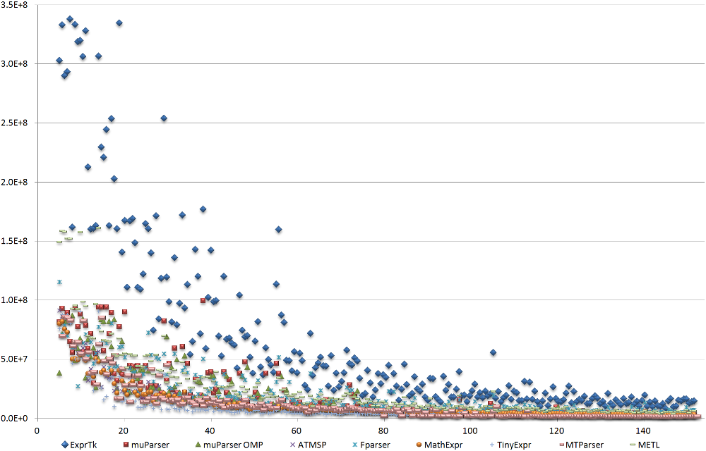 Note: The parsers muParserSSE and ExprTKFloat were excluded due to their use of the float type, and the Lepton and muParserX parsers were excluded due to the fact that their results were consistently 2-3 orders of magnitude slower than all the others.