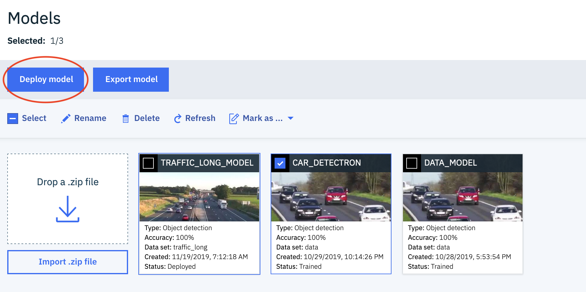 After the model completes training, click the "Models" button in the upper menu. Then, select the model and then click the "Deploy Model" button.