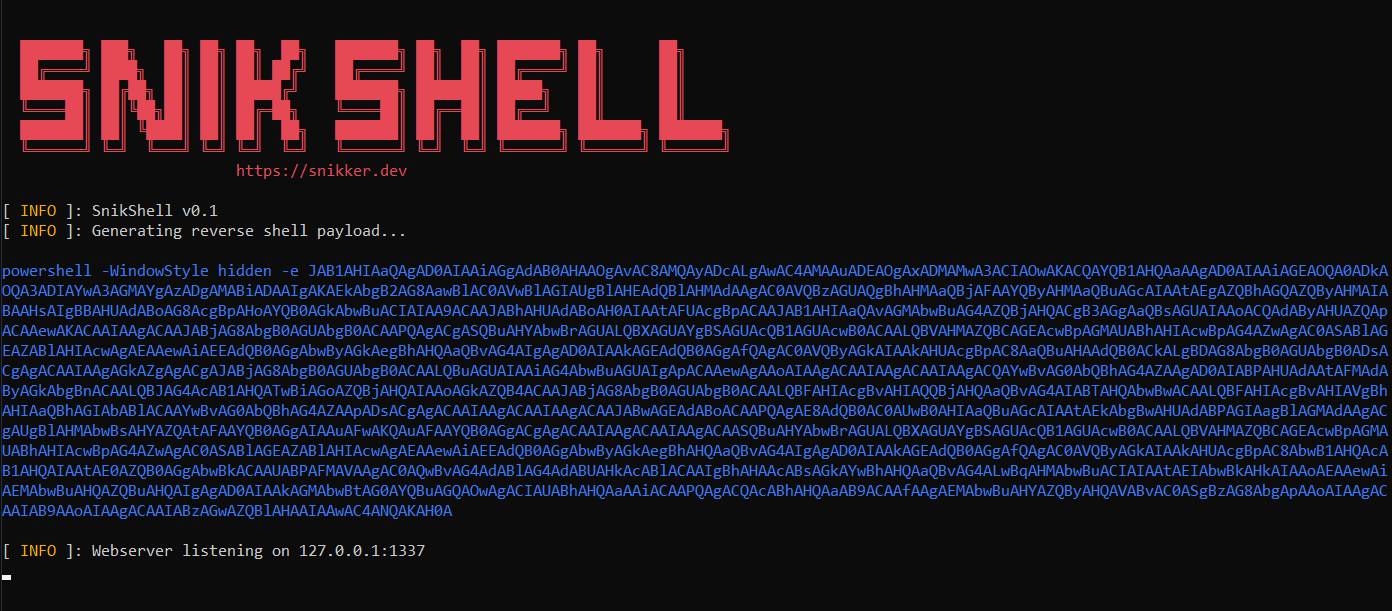 SnikShell is an undetected remote reverse shell written in Python that uses a b64 encoded PowerShell payload. If you like this project, please consider giving it a star!