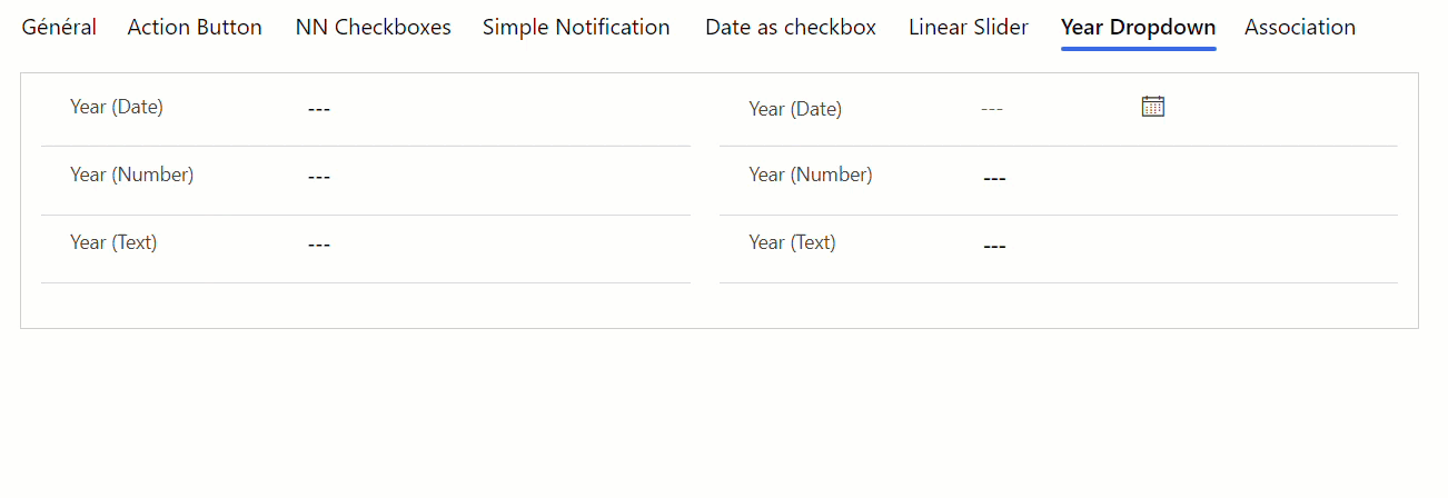 The purpose of this control is to allow user to select a year in a dropdown and store the result in a DateTime, Whole number or Single line of text column.