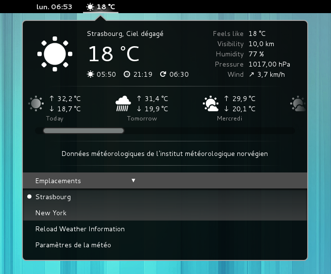 gnome-shell-extension-weather is a simple extension for displaying weather conditions and forecasts in GNOME Shell, featuring support for multiple locations, no need for WOEID, a symmetrical layout and a settings panel through gnome-shell-extension-prefs.