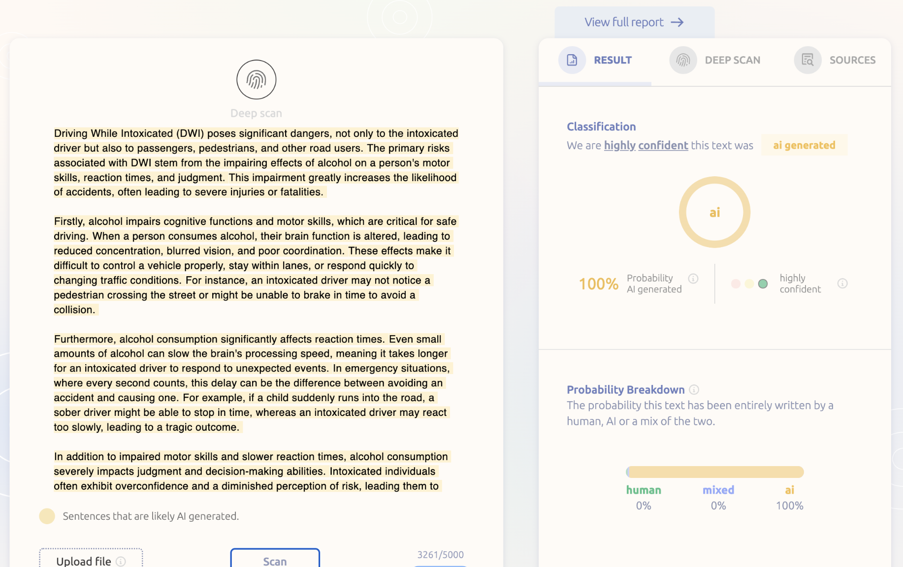 - Pattern Analysis: Detects unusual word choices, repetitive patterns, and syntactic structures.
