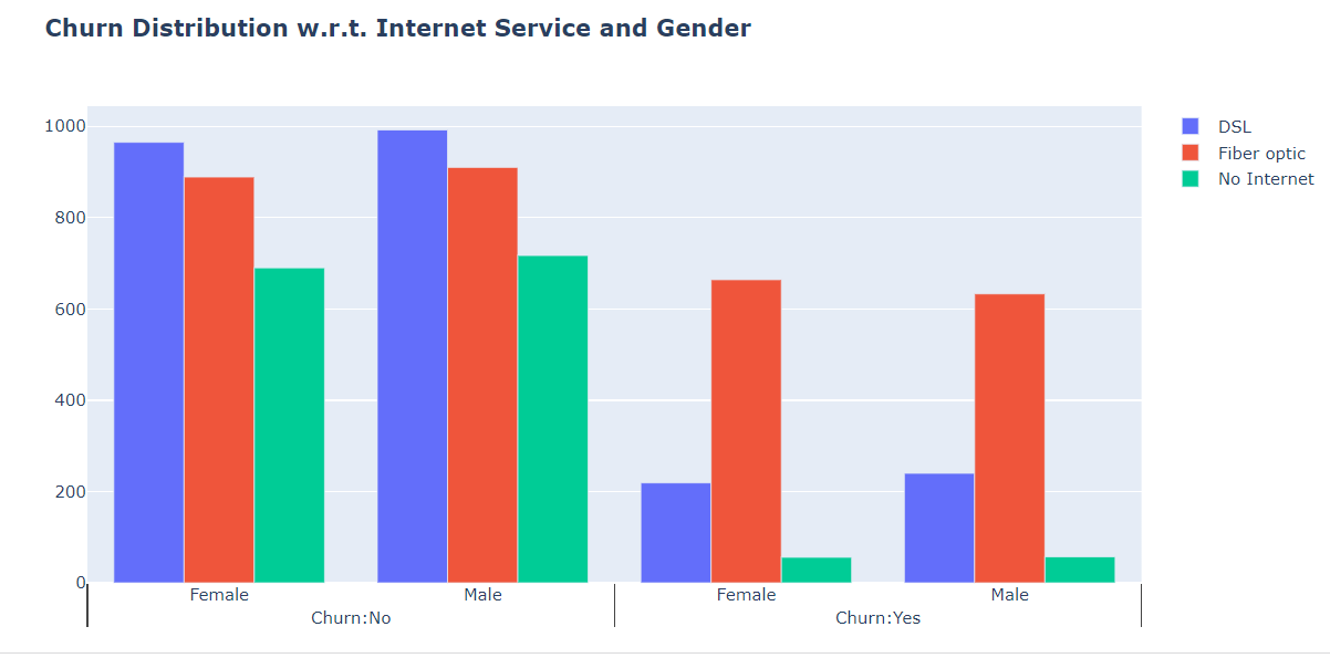 Several customers choose the Fiber optic service and it's also evident that the customers who use Fiber optic have high churn rate, this might suggest a dissatisfaction with this type of internet service. Customers having DSL service are majority in number and have less churn rate compared to Fibre optic service.