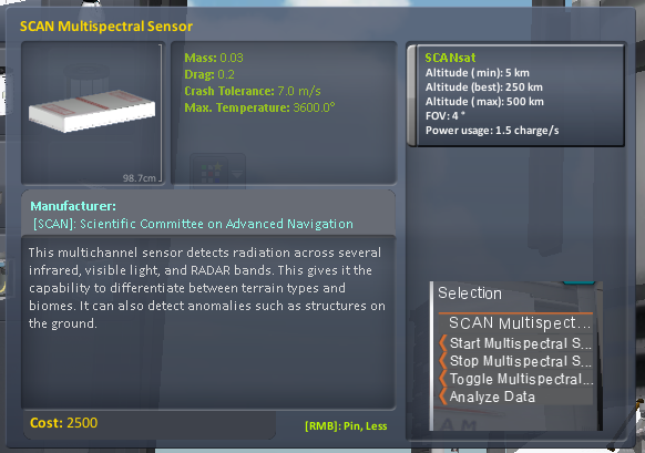 - Sensors: The total number of SCANsat sensors on all vessels; note that all combination sensors are separated into their invidual components, i.e. the Multi-Spectral scanner consists of two sensors, Biomes and Anomalies.