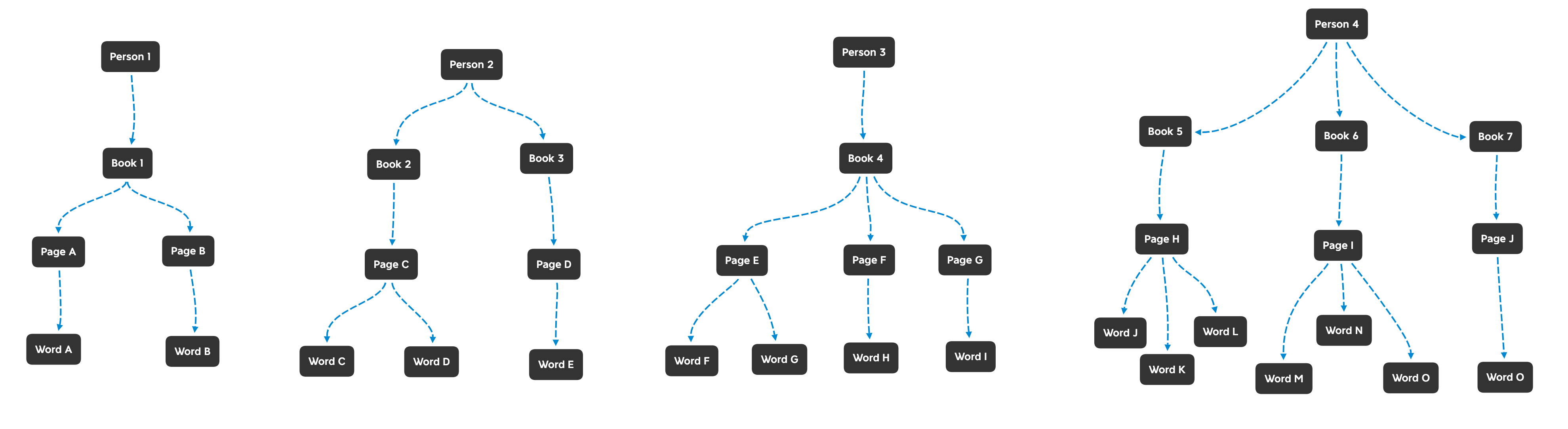 That means: Person is parent of a list of Books, which is parent of a list of Pages, which is parent of a list of Words.