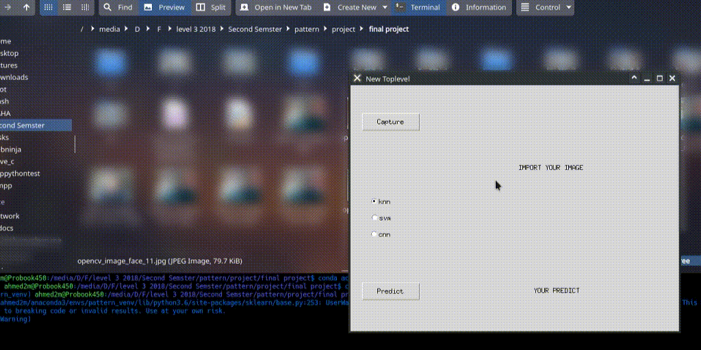 The project has a gui interface for camera capturing and take the picture localize a face and give that face for out three implemented methods of estimating KNN, SVM and CNN trained from the previously mentioned data-set.