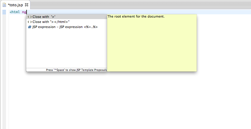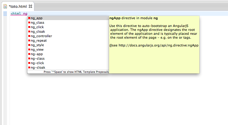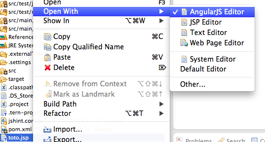 Second, unfortunately, I have troubles with your Eclipse plugin when I try opening a JSP file, either with the standard JSP Editor or with the AngularJs Editor: the ng- attributes are not recognized, while this is the case if I open an ".html" file extension.