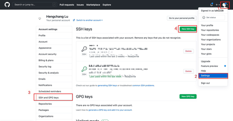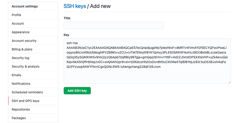 - 以 Github 举例,依次点击 Setting -> SSH and GPG keys -> New SSH Key,把刚才的复制的 SSH 公钥添加到 Github 中