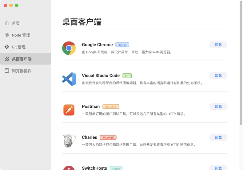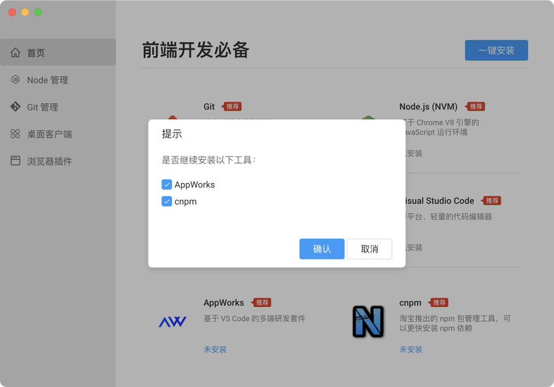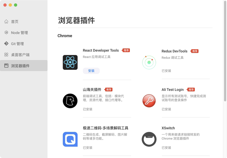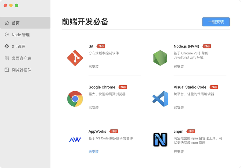- 一键安装前端开发工具:包括但不限于:桌面客户端、编辑器插件、浏览器插件、命令行工具等