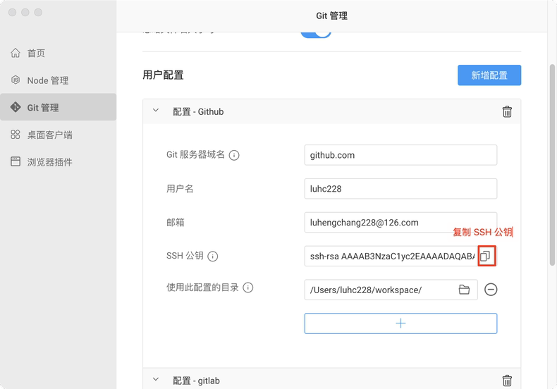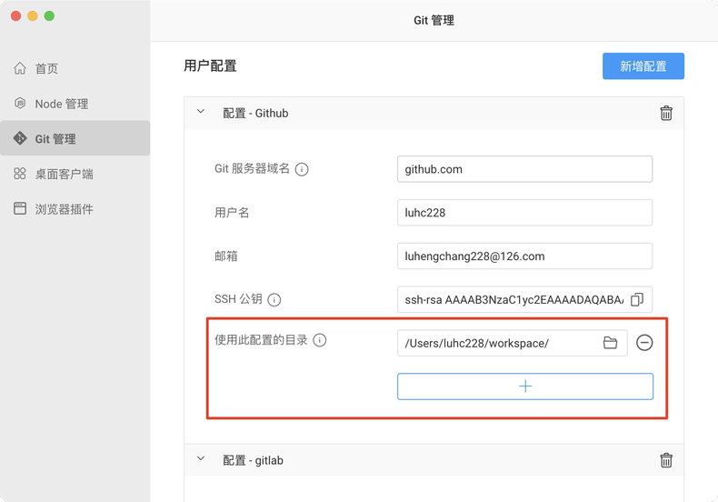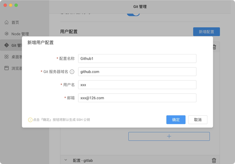 这时就需要在本地配置多份 Git 配置和 SSH 密钥了。Toolkit 为了减少用户的配置成本,支持可视化管理不同用户账号的 Git 配置。