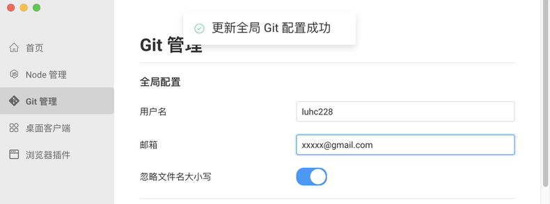目前提供常见的配置项:『用户名』、『邮箱』和『忽略文件名大小写』,后续可根据实际的需要,增加更多的 Git 配置。