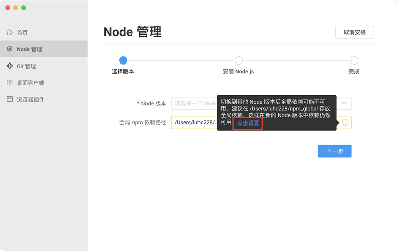 ,切换版本后,之前安装全局命令模块需要重新安装,非常不方便。在 AppToolkit 中可一键配置统一的全局模块安装路径到 ~/npm-global