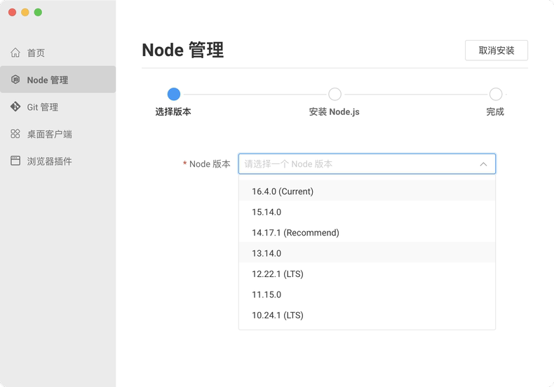在 『Node 管理』页面中点击『切换版本』,选择 Node.js 版本后,点击『下一步』开始 Node.js 安装: