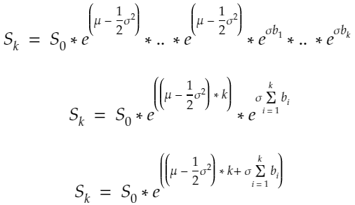 b = {str(scen): np.random.normal(0, 1, int(N)) for scen in range(1, scen_size + 1)}W is the Brownian path and it determines how the stock prices fluctuate from beginning time point(So) to some other time point t.