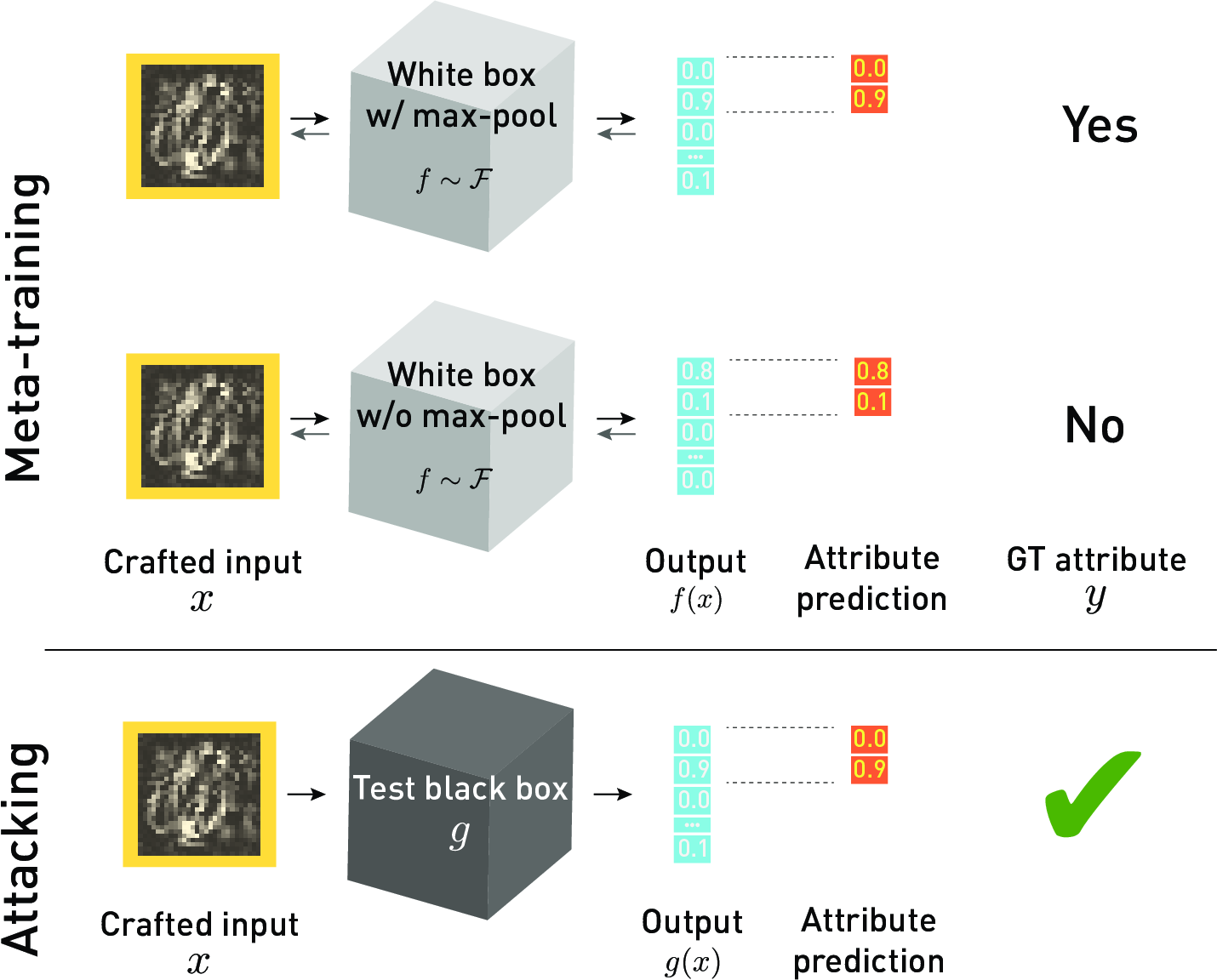 Our second approach - kennen-i - approaches the problem from a completely different point of view. For the sake of clarity, we take an MNIST digit classifier as an example. Over multiple white-box models (training set models), we craft an input that is designed to expose inner secrets of the training set models. This crafted input turns out to generalise very well to unseen black-box models, in the sense that it also reveals the secrets of the unseen black box. More specifically, using gradient signals from a diverse set of white box models, we design a query input that forces an MNIST digit classifier to predict 0 if the classifier has the attribute A, and 1 if it doesn't. In other words, the crafted input re-purposes a digit classifier into a model attribute classifier. See the figure above for the training procedure. We also show below some learned query inputs which are designed to induce the prediction of label 0 if the victim black box has a max-pooling layer, train-time dropout layer, and kernel size 3, respectively, and 1 otherwise.