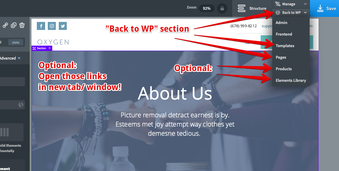 - More links for the "Back to WP" section in Oxygen Builder interface itself -- Oxygen Templates, WordPress Pages, WooCommerce Products, Oxygen User Elements Library