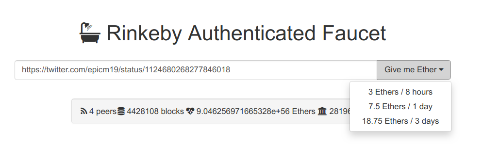 W celu uruchomienia naszego kontraktu na sieci Rinkeby będziemy potrzebowali Etheru, którym zapłacimy za deploy kontraktu. Darmowy Ether możemy uzyskać pod adresem https://faucet.rinkeby.io. Strona powinna wyglądać tak jak poniżej.