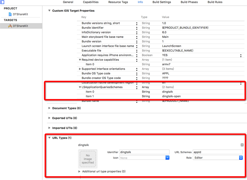 - 将申请的appId添加到URL Types中作为钉钉回调的scheme, identifier 填写dingtalk; URL Schemes填写申请的AppId。 iOS9及以后的系统需要将钉钉和分享SDK的scheme配置在Info.plist。LSApplicationQueriesSchemes列表中,scheme分别为 dingtalk, dingtalk-open