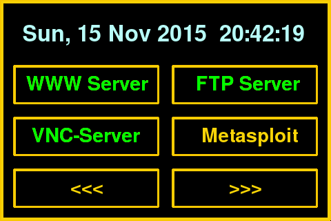 My basic touch pi menu with a top label with your hostname and IP address, one open button and working buttons for Desktop, Terminal, Configuring Wifi, Reboot and Shutdown.