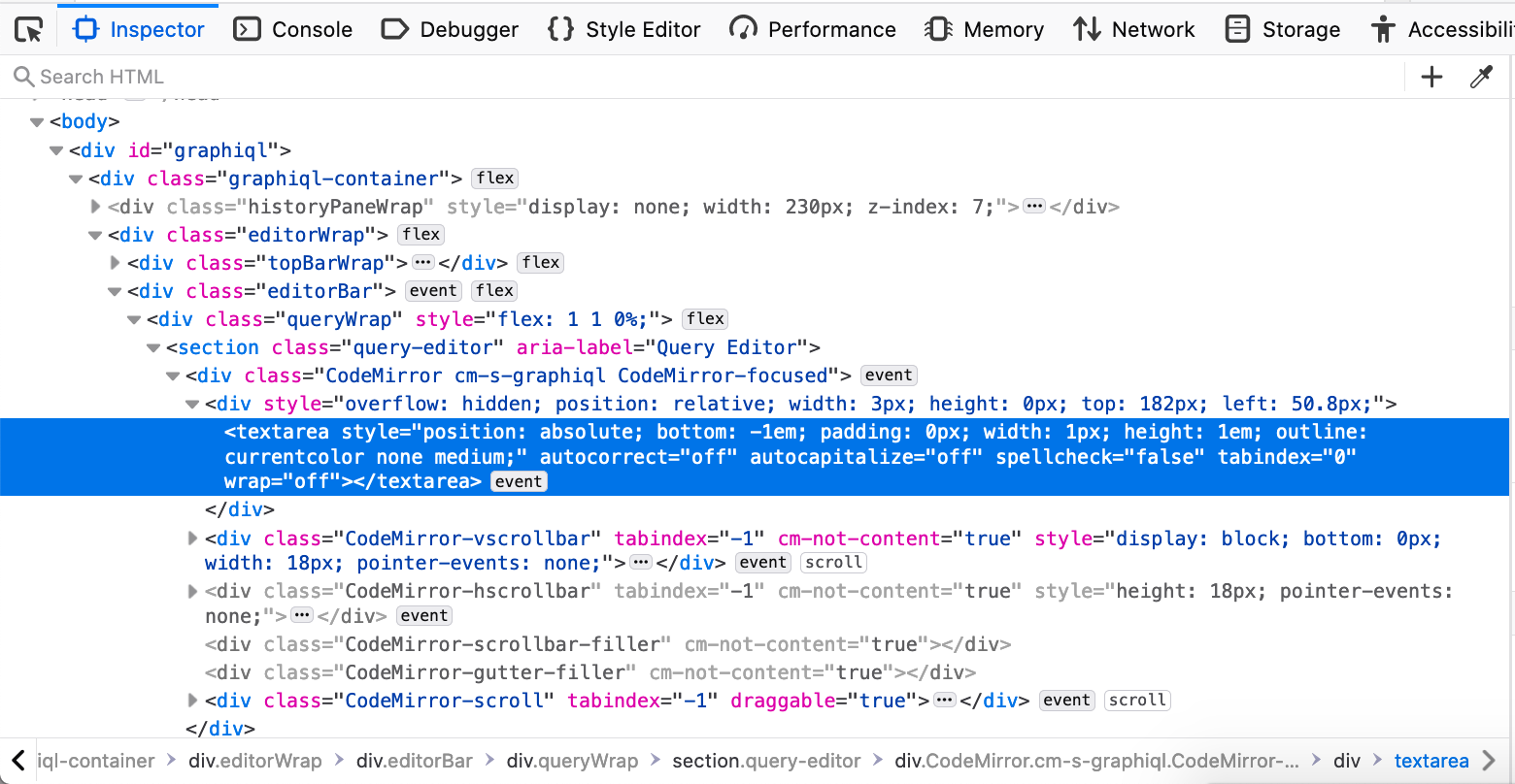 I don't think it matters now but it may eventually, but our instantiation pattern for GraphiQL query editor is a bit different from the generic Codemirror example that tends to use<textarea />