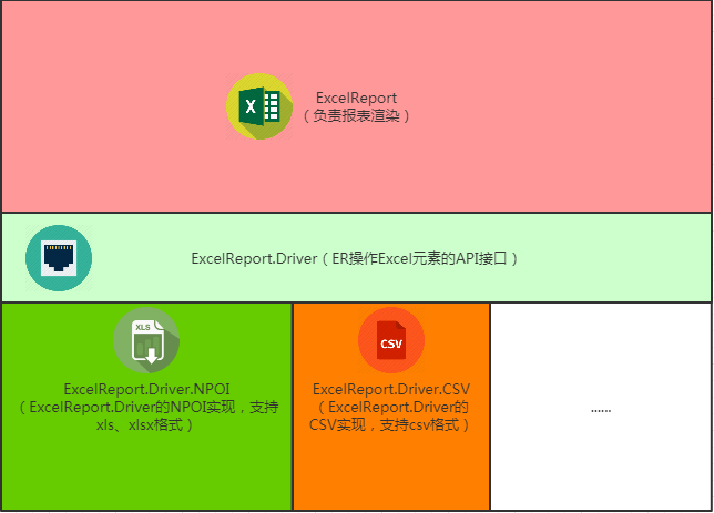 ExcelReport.Driver.NPOI是使用NPOI对ExcelReport.Driver的实现。支持xls、xlsx两种格式的Excel文档。ExcelReport.Driver.CSV是针对csv格式的Excel文档对ExcelReport.Driver的实现。