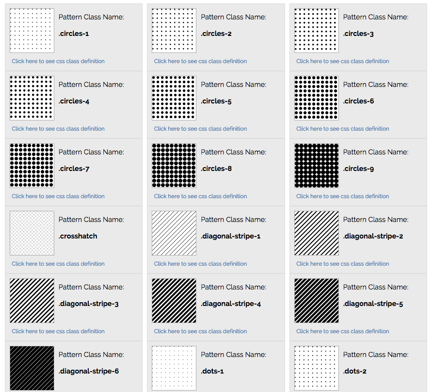 Css patterns utilize image fills. For exmple, the following is a definition of one of our patterns, converted to base64 string and turned into a css class definition: