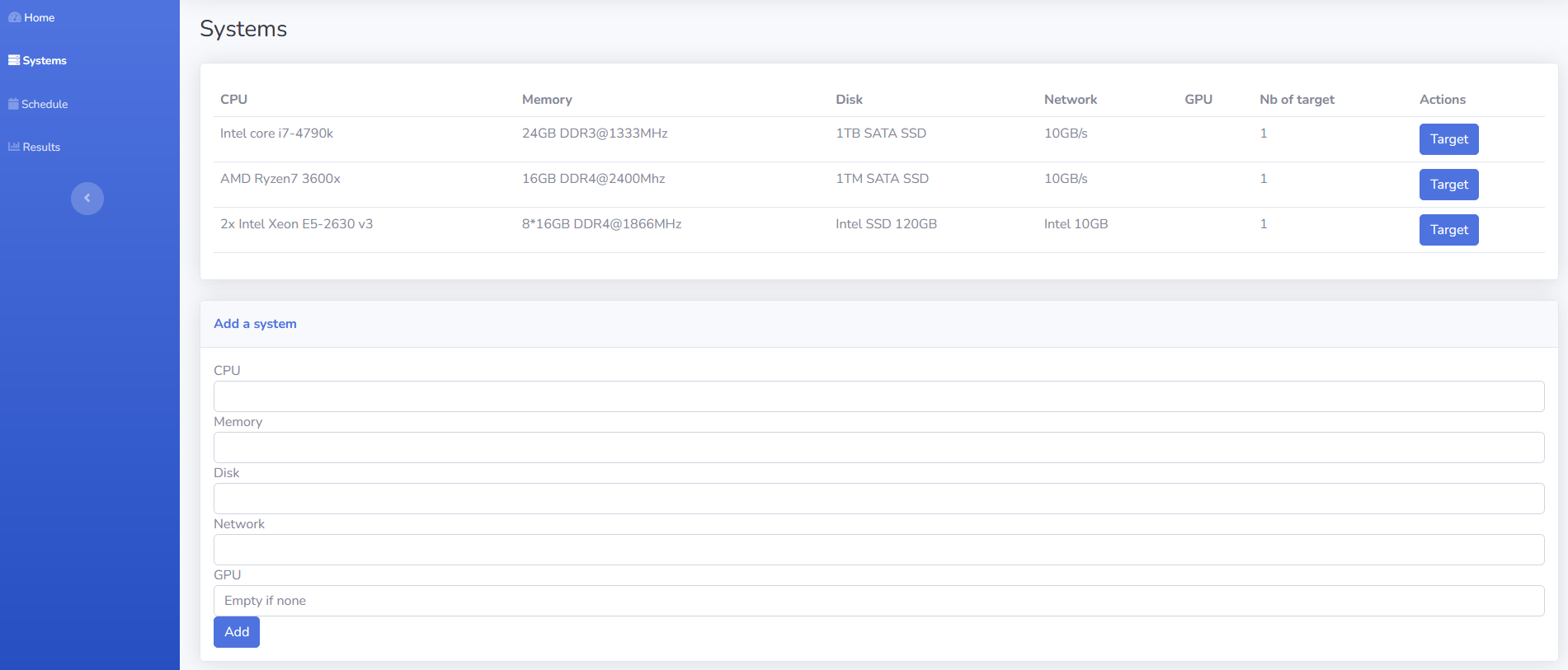 The system is composed of a control plane and one or more tested systems. a tested system is made of one or more targets with the exact same configuration. this can be used to accelerate the benchmarks but it can also reduce the iperf and rest benchmark accuracy.