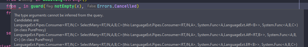 An additional question, in WriteToQueue I have to use ternary operator to check whether x is empty or not. Why the more elegant guard(notEmpty(x), Errors.Cancelled) is not work for me (Type arguments cannot be inferred...)?