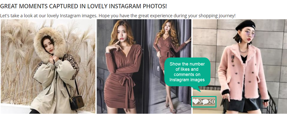 A: With Instagram Feed, it is possible to set the number of Likes and Comments be displayed. Customer can easily see the visibility and popularity of the images.
