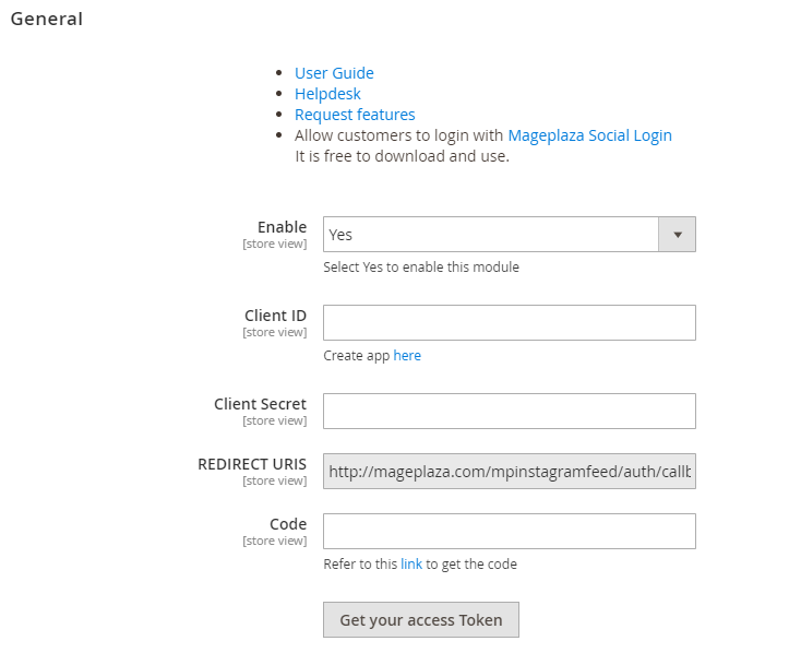 From the Admin Panel, go to Store > Settings > Configuration > MAGEPLAZA EXTENSIONS > Instagram Feed