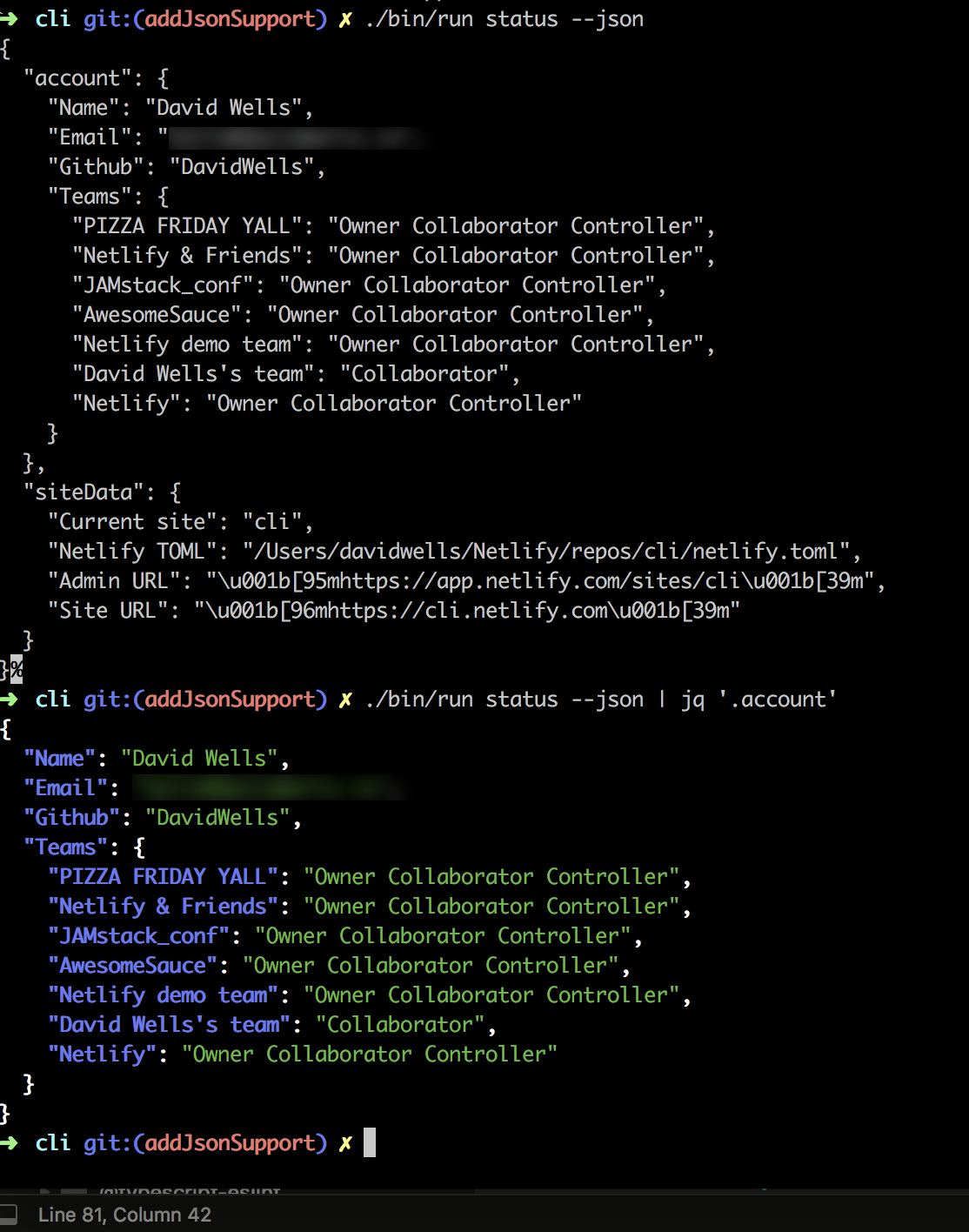--jsonflag support for relevant commands.This will disable normal CLI logging and only output