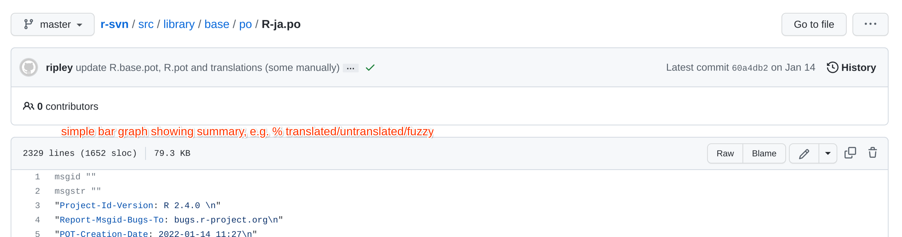 gettextsystem of library translation. They have a relatively simple structure.I think it would be super helpful for i18n teams to provide a simple "progress summary" at the top of the blob file view of such a file when loaded, e.g. this file