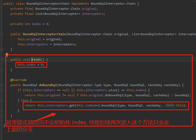 PageInterceptor中配置boundSqlInterceptors参数,设置自定义的BoundSqlInterceptor,进行拦截,修改前置修改SQL然后在进行分页,但是这个配置只会进行一次调用,debug发现是调用完这个链之后不会初始化 index,如下图