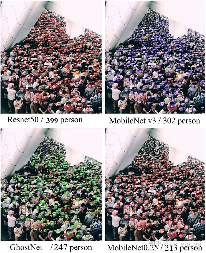 After the test in the previous section, and took a picture containing only one face for detection, it can be found that resnet50 for the detection of a single picture and the picture contains only a single face takes longer, if the project focuses on real-time then mb0.25 is a better choice, but for the face dense and small-scale scenario is more strenuous. If the skeleton is replaced by another backbone, is it possible to balance real-time and accuracy? The backbone replacement here temporarily uses ghostnet and mobilev3 network (mainly also want to test whether the effect of these two networks can be as outstanding as the paper).