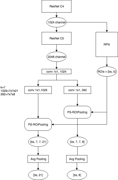 - R-FCN architecture: We refered to the origin [Caffe version] of R-FCN, the main structure of R-FCN is show in following figure.