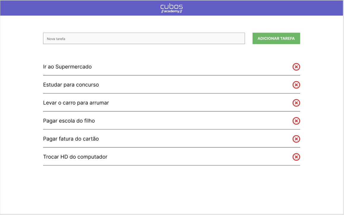 Este é um projeto que eu desenvolvi no terceiro módulo da Cubos Academy. É basicamente um organizador de tarefas, onde você pode adicionar e excluir tarefas. Para utilizar é bem simples, basta você digitar na entrada a tarefa a ser adicionada e clicar em adicionar ou pressionar a tecla enter. E para excluir, só clicar no xis vermelho.