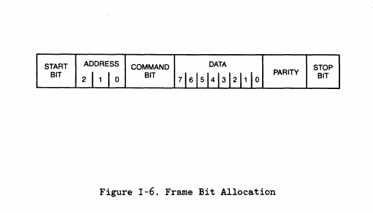 The command bit distinguishes a command from data. The address field indicates the destination device in a frame sent by the main processor, or the source device in a frame sent by a device. A universal address (000) is used to send a single command to all devices. The a-bit data field contains the opcode for a command, or a bits of data.