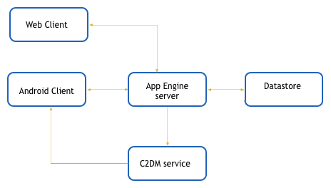 The basic architecture of this project is as Figure 1 below. App Engine plays as a server and stores relevant information in Datastore. Meanwhile, it also serves the android client when requested. The way of sending data from servers to their applications on Android device is through Android Cloud to Device Messaging (C2DM), which provides a simple lightweight mechanism that servicers can use to tell mobile applications to contact the server directly, to fetch updated application or user data.