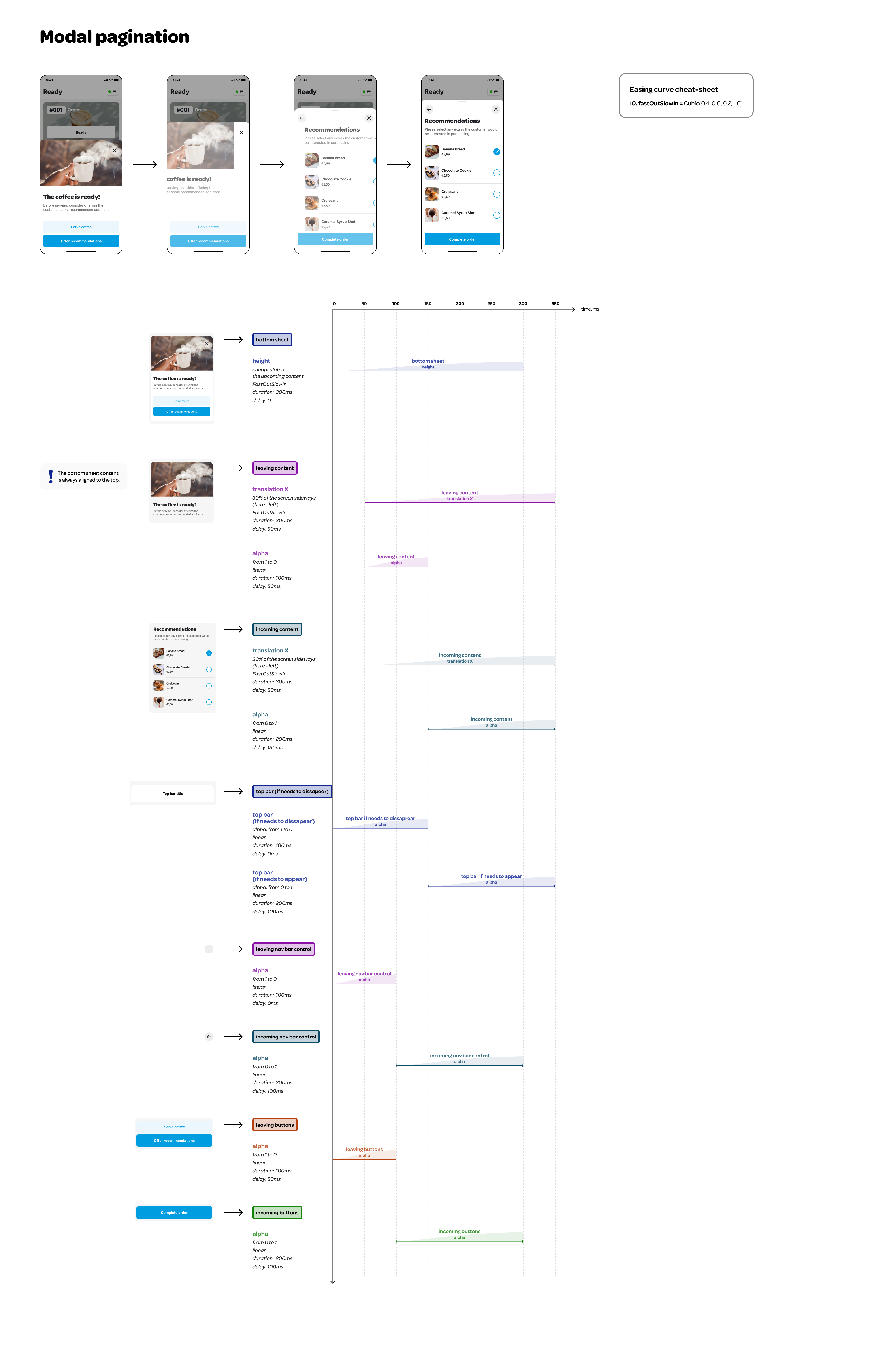 Motion Specs for Modal Interactions: To complement the static design aspects, this section demonstrates motion specifications for pagination and scrolling interactions. It includes guidelines for animating transitions between modal sheet pages and within the content scroll, enabling designers to specify dynamic, engaging user experiences.